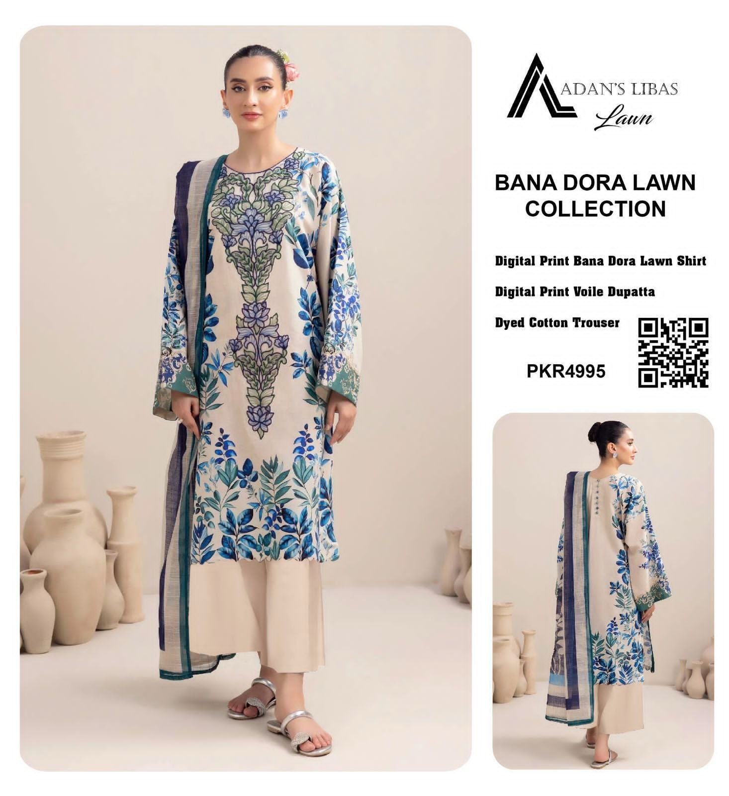 Refresh your summer wardrobe with this graceful Bana Dora Lawn ensemble by Adan’s Libas. This 3-piece outfit showcases a digitally printed lawn shirt in a soft ivory base, beautifully adorned with intricate botanical motifs in shades of blue, teal, and hints of green. The symmetrical design on the front adds a refined and elongating effect, enhancing the overall elegance of the outfit.