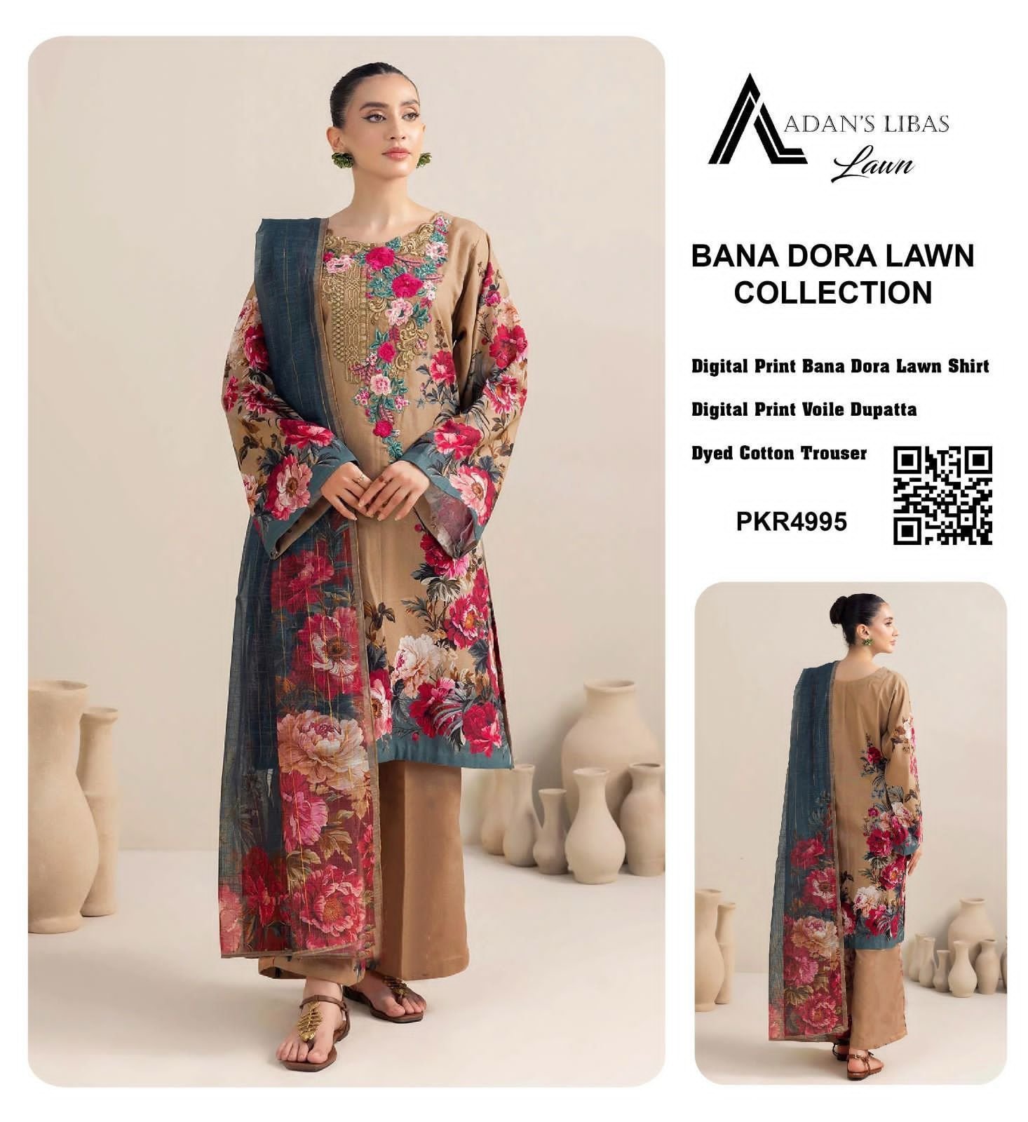 Elevate your everyday style with this stunning Bana Dora Lawn ensemble by Adan’s Libas. Designed to make a statement, this 3-piece outfit features a beautifully crafted digital printed lawn shirt in a rich beige base, adorned with bold floral patterns in shades of red, pink, and green. The intricate neckline detailing adds a touch of elegance and sophistication to the overall design.